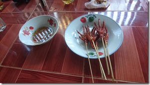 Als der Pool zusperrt und wir uns wieder auf den Rückweg machen, treffen wir noch die anderen. Die sind inzwischen in einer Hütte eingekehrt, wo es eine lokale Spezialität gibt: gegrillte Hühnerfüße.