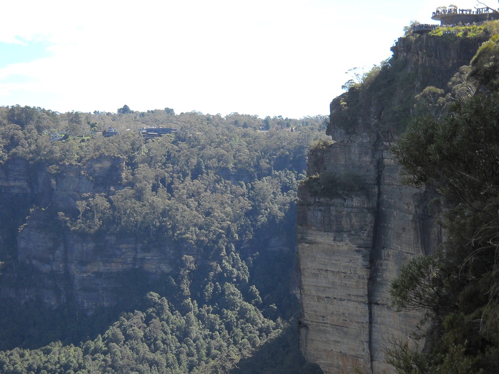 Hier ist links das zweite Hauptmotiv aller Fotos von hier – die Katoomba Falls. Allerdings hat der Wasserfall derzeit so wenig Wasser, dass er sogar gegen die Wasserlochklamm in Wildalpen abstinkt. Ein kleinerer Wasserfall beim Raufgehen ist der Witches Leap. Heißt so weil ein Schotte in dem Fels eine Frau erkannt hat. |